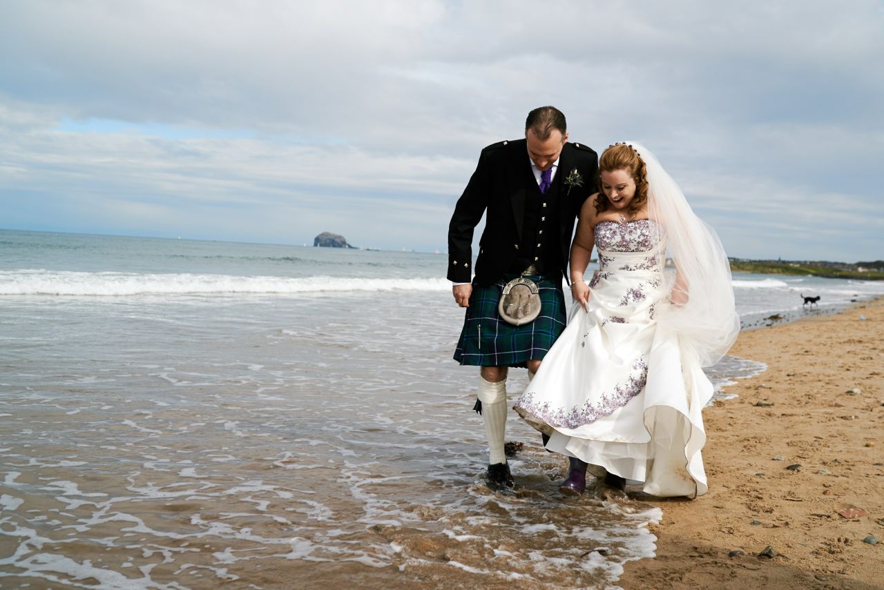 The third photo is when we had left the church after we were married and the amazing feeling of being finally married after 16 years together. We had a lovely drinks reception at the church before heading off to the Marine hotel and our walk on the beach along with my lovely purple wellingtons.