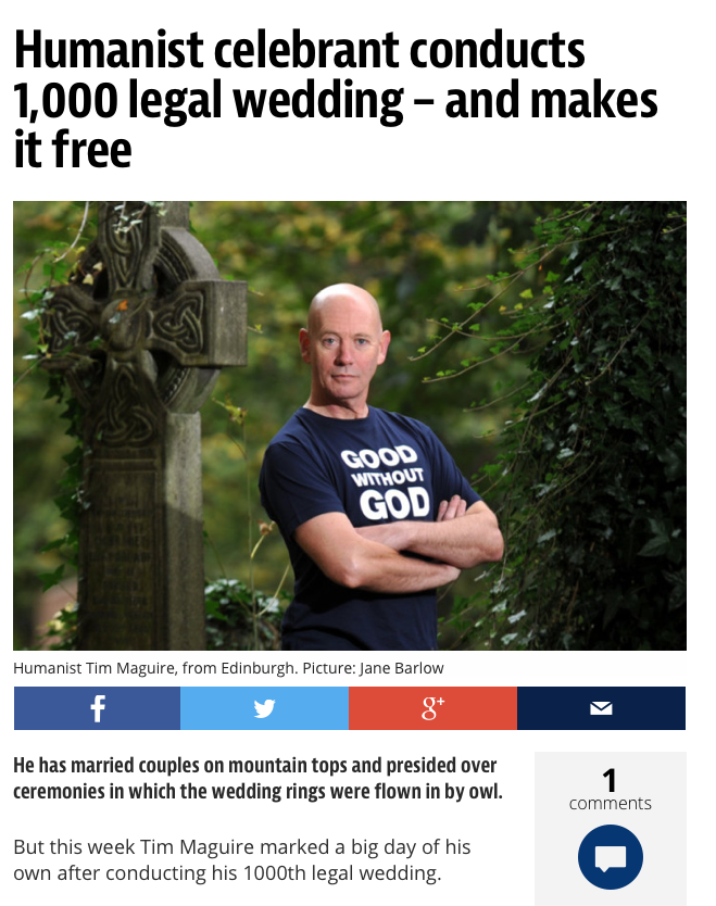 It was quite a day at Prestonfield House yesterday, when I conducted the wedding of Robyn and Paul. As luck would have it, theirs was my 1,000th legal marriage, so I gave it to them as a wedding present.