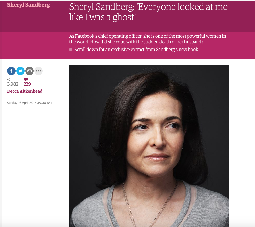 I was very moved by this interview with Facebook COO Sheryl Sandberg in The Observer, where she talks about how she coped with going to sleep beside her 47 year old husband, and waking up to discover that he was dead.