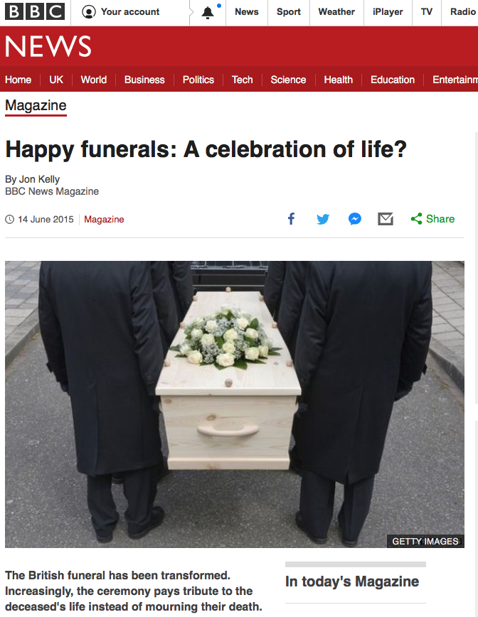 Two years ago, the BBC ran this story based on an ICM survey, in which it found that 54% of people wanted a ceremony that was ‘a celebration of life’. Almost as many wanted to incorporate their favourite colour, football team, hobby or music. They wanted it to be happy.