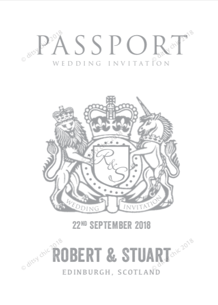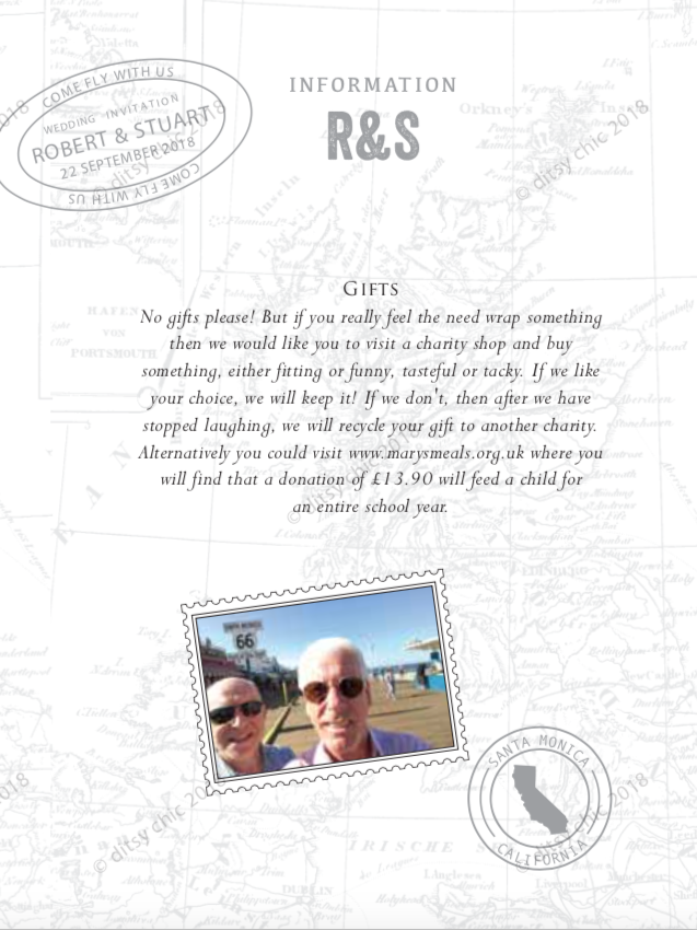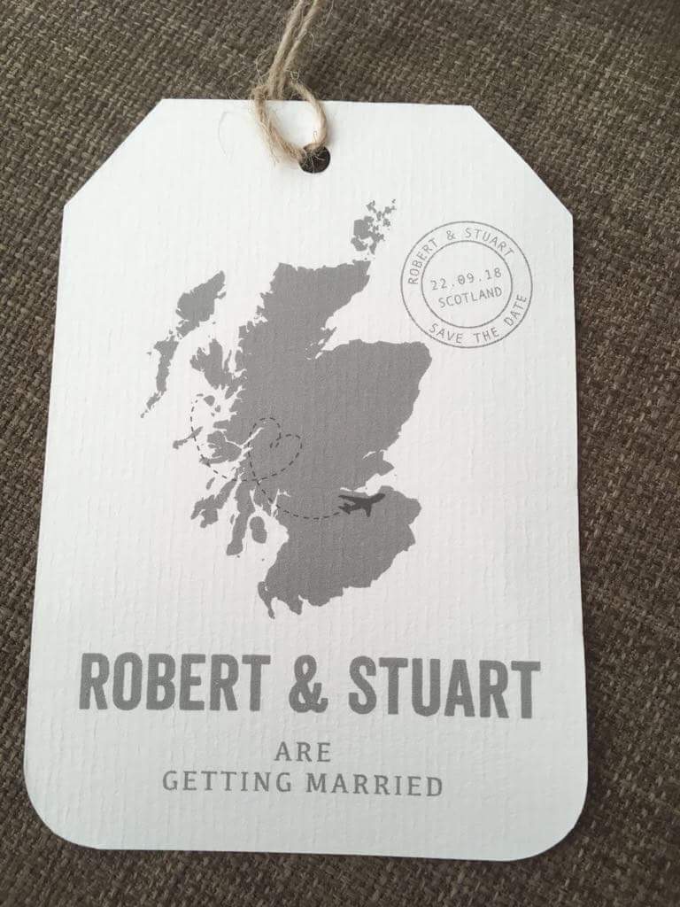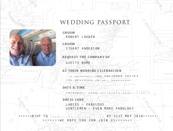 Stuart and Robert met just over 40 years ago, and they’re very widely travelled gentlemen. So are their guests, and their designer Marianne Lethbridge reflected their love of travel in her ‘Save the Date’ cards, which came in the form of luggage tags.