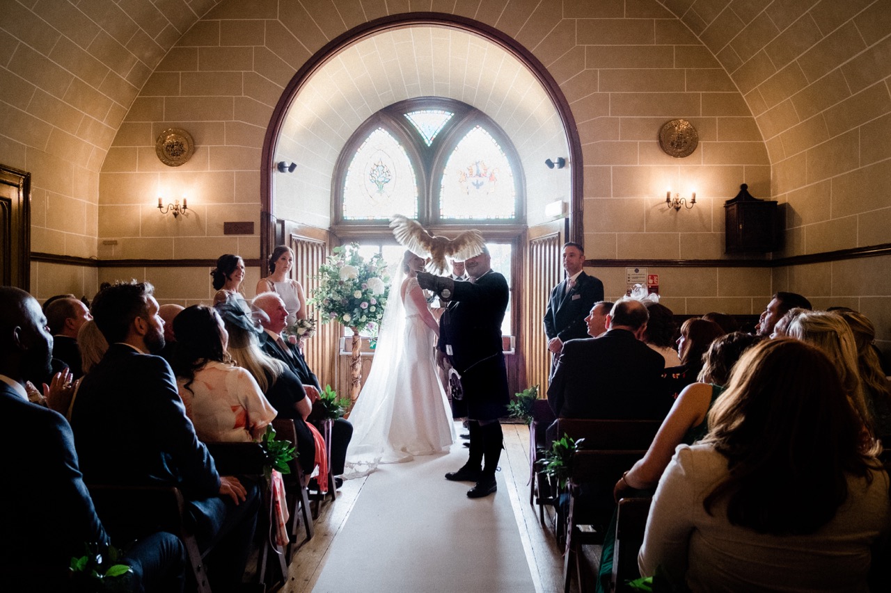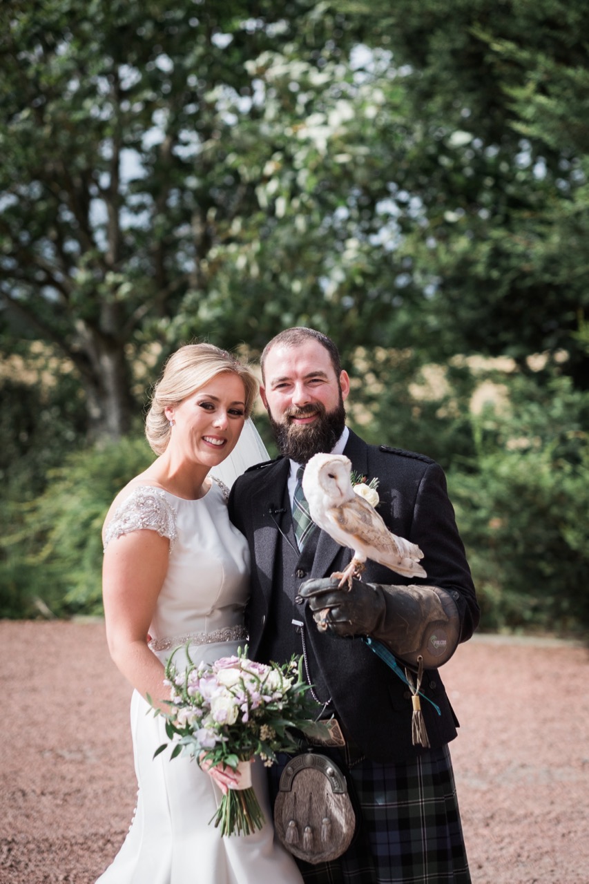 Dalhousie Castle is the go-to wedding venue if that’s something which appeals to you: they have a falconry centre in their grounds, and a diverse range of raptors from sparrowhawks to golden eagles, but it’s usually Bella the Barn Owl who performs the honours at weddings, as you can see in this great shot from Dan at Fern Photography.