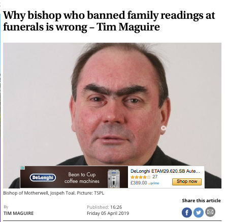 I saw a story the other day that took me aback a bit. Father Joseph Anthony Toal is the Roman Catholic Bishop of Motherwell and he found himself all over the papers when an instruction he’d sent to his clergy was leaked to a journalist. He even made the Daily Telegraph.