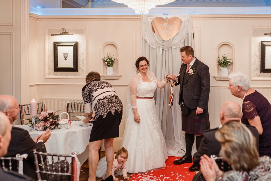 and they invited their mothers, Marianne and Wilma, to perform a hand-fasting with multi-coloured cords that they had woven themselves.