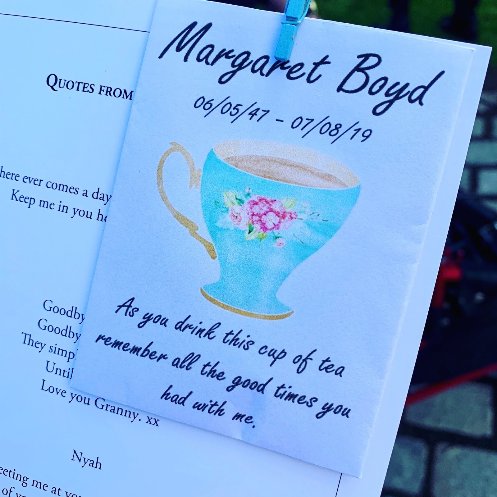She was a real ‘tea Jenny’. Even when she was visiting her son, Stephen, in the 35 degree heat of Brisbane, she never left the house without a flask of her favourite beverage, so I thought it was a lovely, imaginative touch on the part of the family to give all the mourners a wee teabag to remember her by.