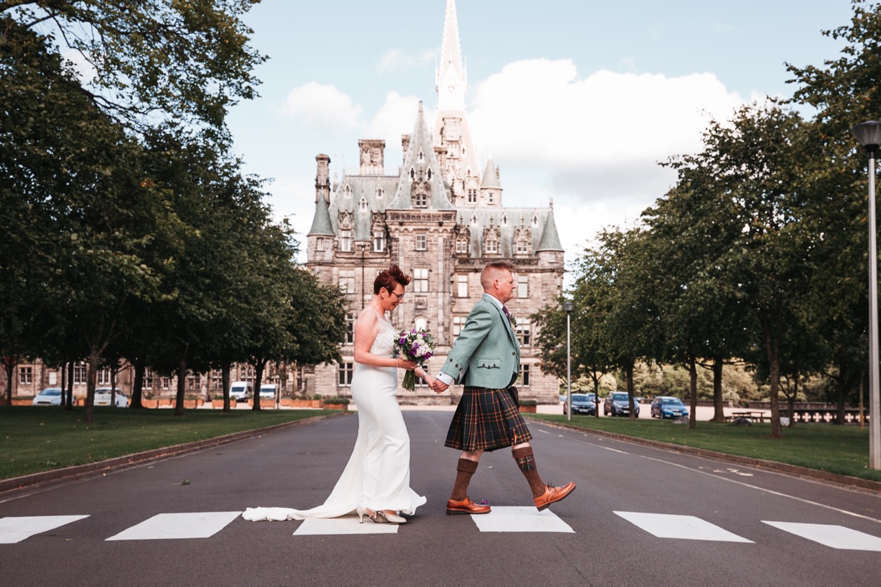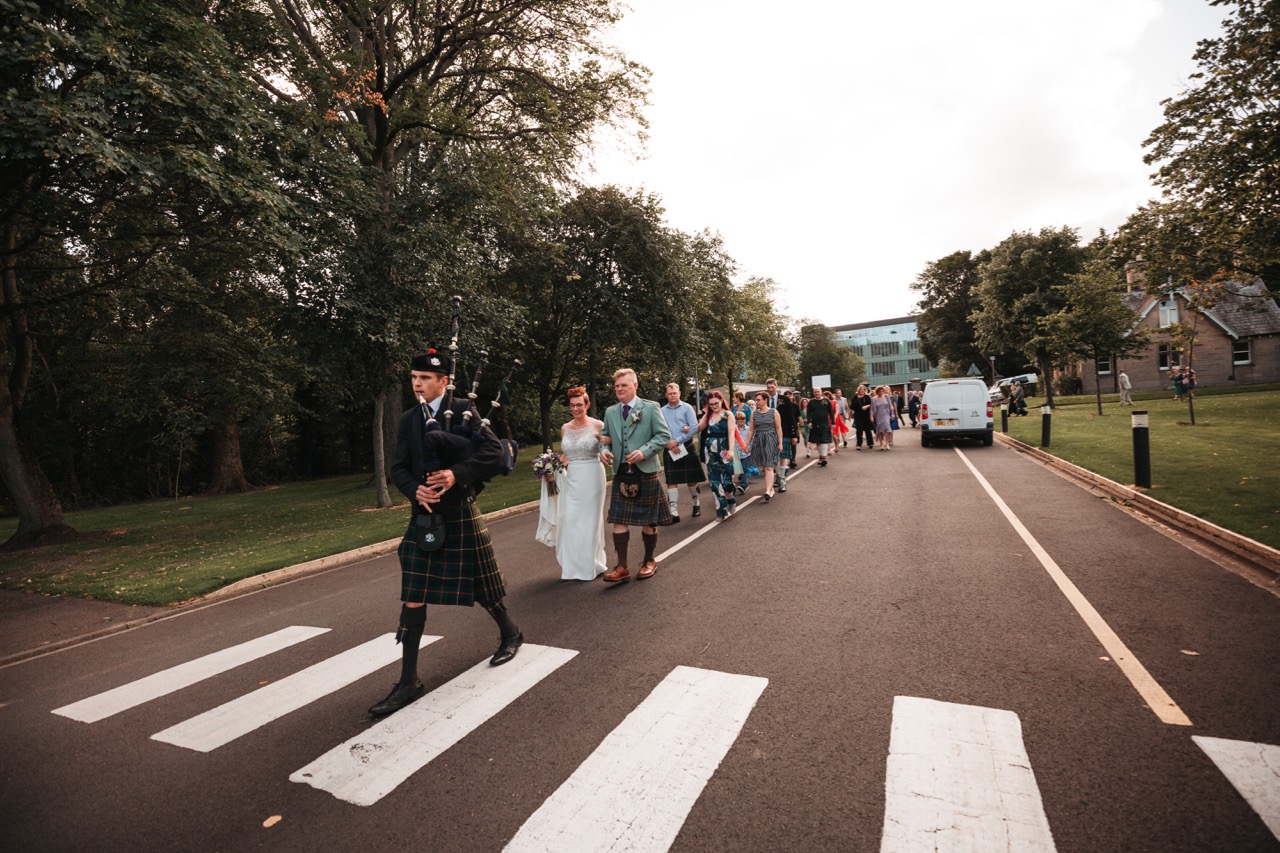 Of course as we were at Fettes, our piper Tom was part of the school’s pipe band, and he led the guests along the drive for the big photo call.