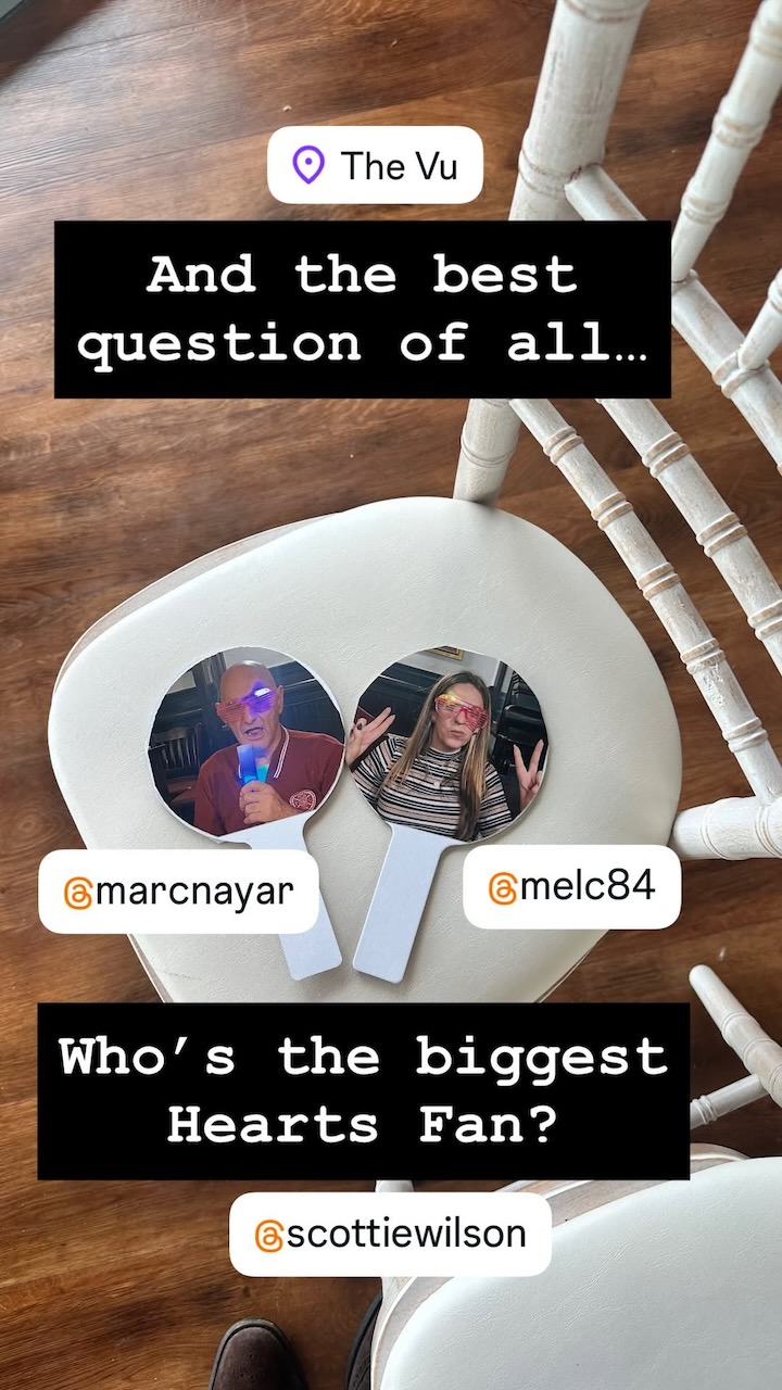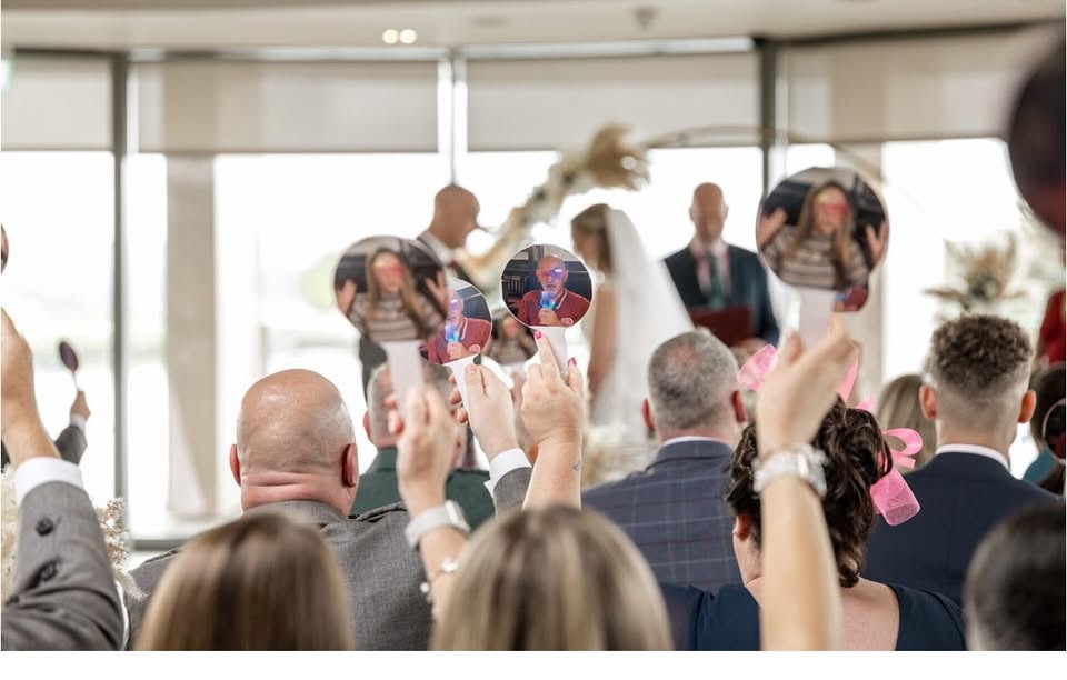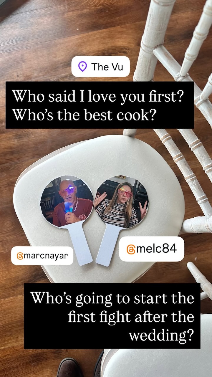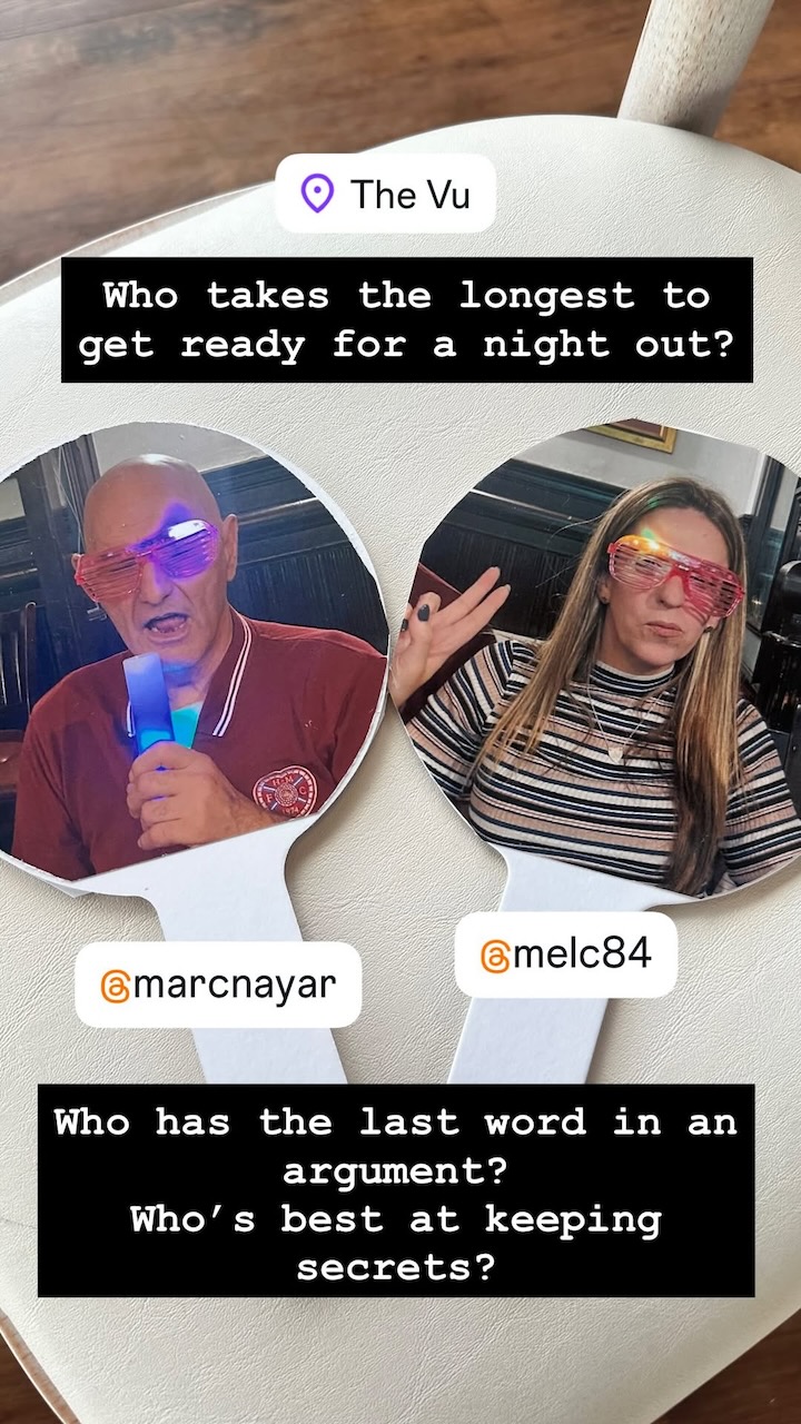 When the guests arrived, they all found a paddle on their seat. Mark was on one side and Mel was on the other, and I asked them a series of questions…